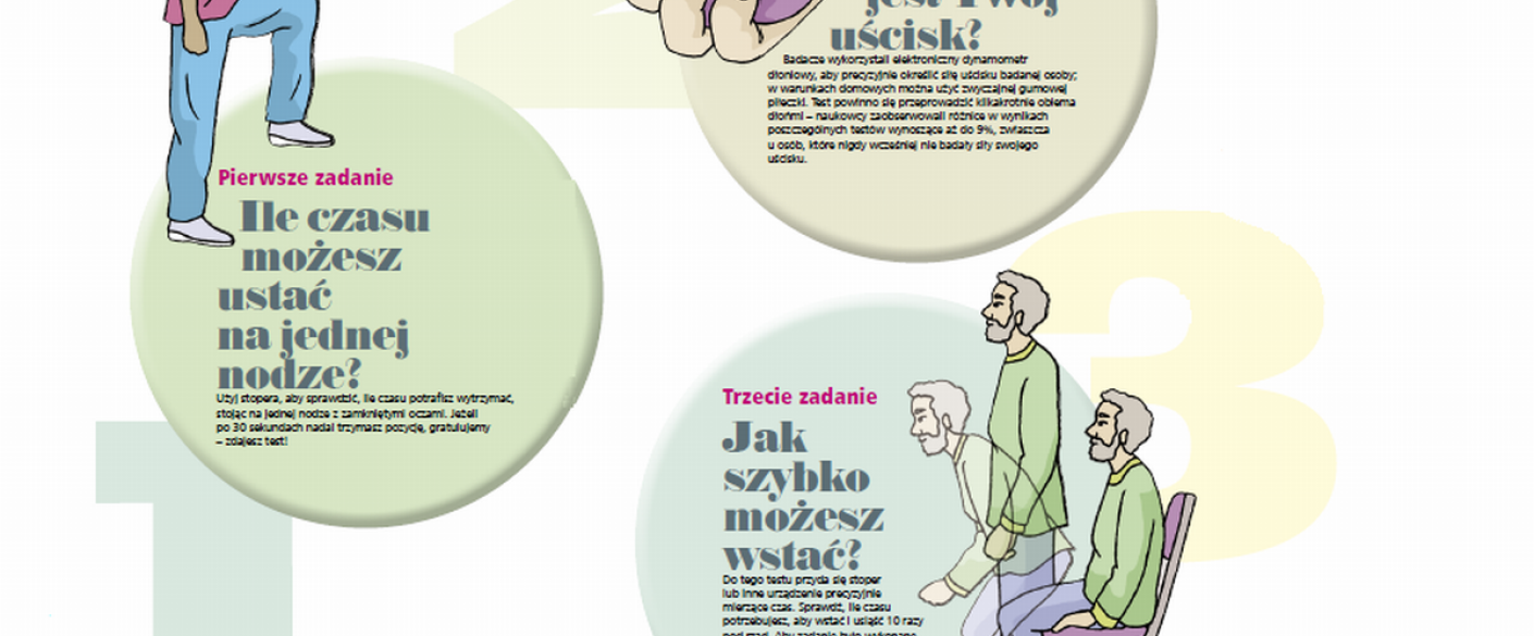 Testy na długość życia przedstawiamy na obrazku. Zwracamy jednak uwagę, że nawet jeśli ktoś nie jest w stanie wykonać żadnego z zadań, nie oznacza to wcale, że powinien od razu wybierać się na tamten świat. Niepowodzenie może sygnalizować konkretny problem kliniczny lub też być po prostu oznaką procesu starzenia. Warto potraktować je więc jako sygnał do poprawy diety i mobilizacji do ćwiczeń, dzięki czemu szanse przeżycia kolejnych 13 lat wzrosną.