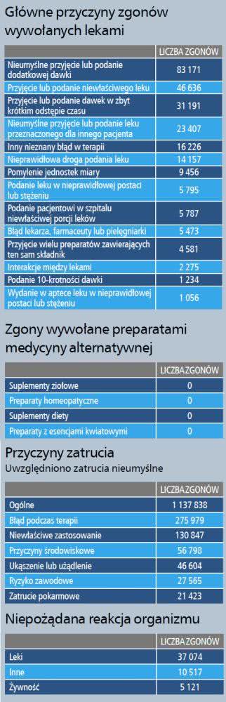 Zatem ilu ludzi każdego roku pada ofiarą leków na receptę? O dziwo, liczba ta jest praktycznie niemożliwa do oszacowania, jako że większości z tych zgonów się nie rejestruje. Najnowsze szacunki Amerykańskiego Stowarzyszenia Centrów Kontroli Zatruć pozwalają jednak zorientować się w skali problemu1.