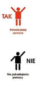 - "Tak, potrzebuję pomocy" - sylwetka na kształt litery Y (yes) z obiema rękami uniesionymi do góry.