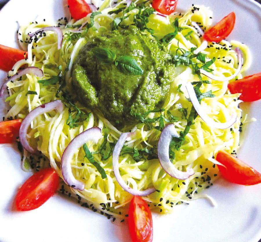 Używanie spiralnego nożyka do owoców to świetny sposób na otrzymanie wegetariańskiego spaghetti. Alternatywnie (tak właśnie robiłam je w czasie letniej podróży) możesz użyć ząbkowanej obieraczki, aby otrzymać z cukinii cienkie paski "makaronu". Ugnieć je intensywnie razem z olejem, solą, czosnkiem, aż do uzyskania miękkiej masy.