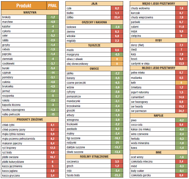 Tabela PRAL (Potentail Renal Acid Load - potencjalny obciążenie nerek kwasem)