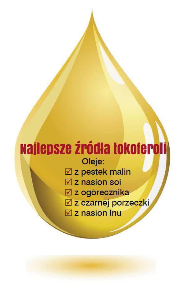 W olejach tłoczonych na zimno dominującą jej formą jest gamma-tokoferol. Co prawda jego zdolność wymiatania wolnych rodników to 25% aktywności witaminy E, ale w przeciwieństwie do postaci alfa działa również przeciwzapalnie, a w badaniach na ludziach i zwierzętach jego stężenie było odwrotnie proporcjonalne do zachorowalności na choroby układu krążenia i degeneracyjne12. Najwięcej tokoferoli można znaleźć w olejach z pestek malin (prawie 2 g/kg oleju), które zawierają też stosunkowo dużą ilość jego postaci alfa, a także karotenoidy dodatkowo wzmacniające właściwości przeciwutleniające13.