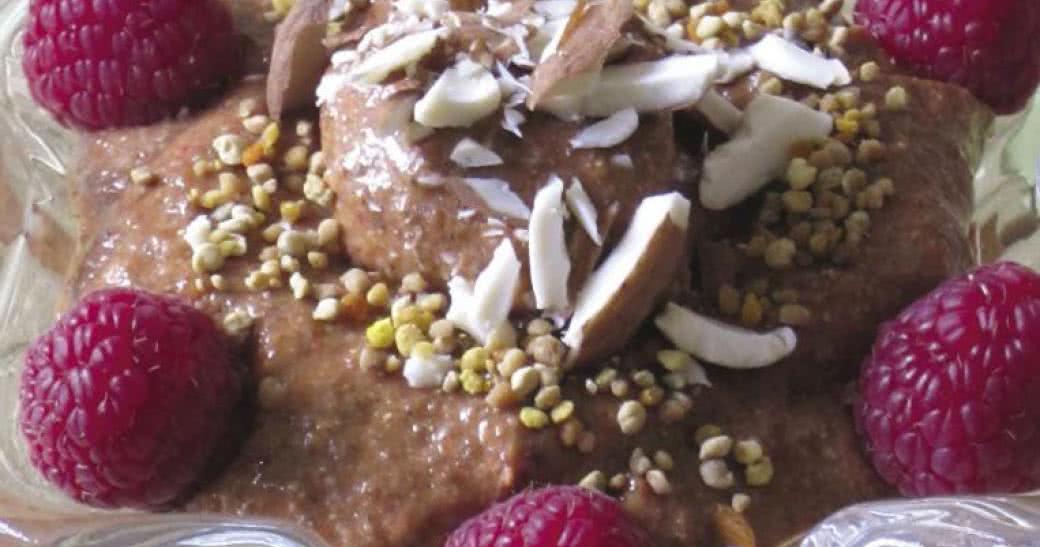 Zmieszaj wszystkie składniki w blenderze na wysokich obrotach, najlepiej po uprzednim namoczeniu suszonych owoców, aby łatwiej było je zmiksować. Całość posyp posiekanymi migdałami oraz pyłkiem pszczelim. Możesz udekorować danie kilkoma malinami czy innymi kolorowymi owocami. Smacznego!