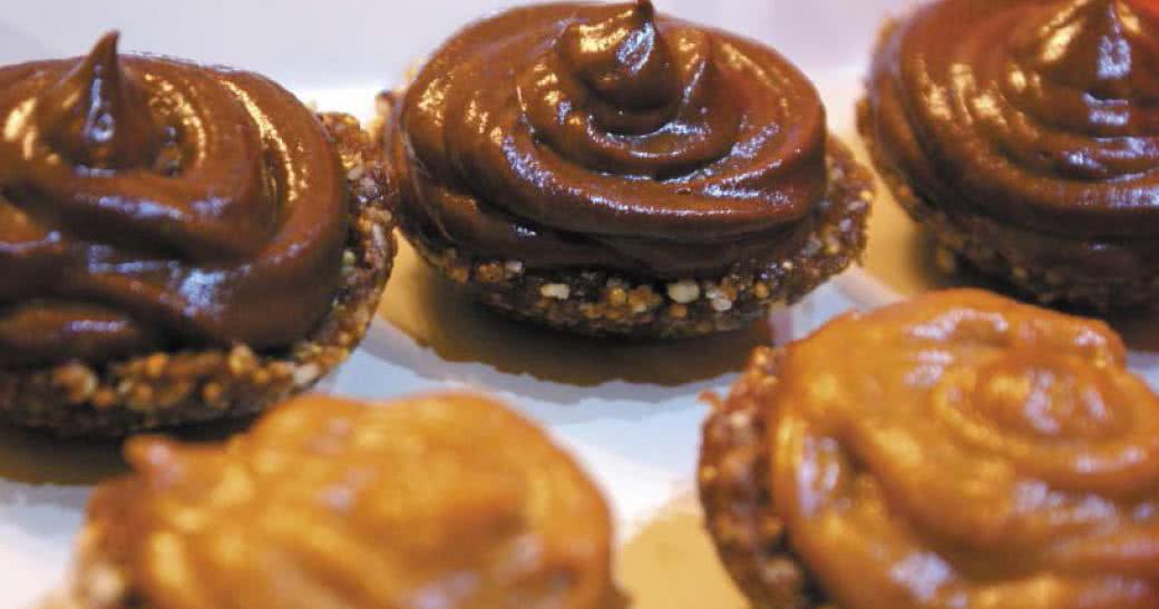 Polewa karmelowa: 1/3 oleju kokosowego z pierwszego tłoczenia, 1/4 szklanki orzechów piniowych, 15 daktyli, 1 łyżka proszku maca, 4 łyżki proszku algarroba, 2 goździki, 1/8 łyżeczki soli himalajskiej, 1/4 szklanki wody