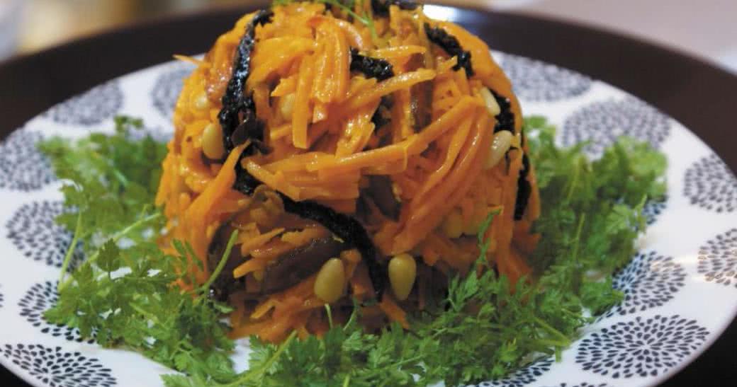Składniki: 2 szklanki dyni startej na tarce w kształt makaronu, 1/4 szklanki orzeszków piniowych, namoczonych w wodzie, 6 suszonych moreli pokrojonych w plasterki, 6 połówek suszonych pomidorów pokrojonych w plasterki, 1 łyżka soku z cytryny, 2 łyżki oleju słonecznikowego tłoczonego na zimno, szczypta pieprzu kajeńskiego, szczypta soli himalajskiej (opcjonalnie), garść świeżej trybuli ogrodowej