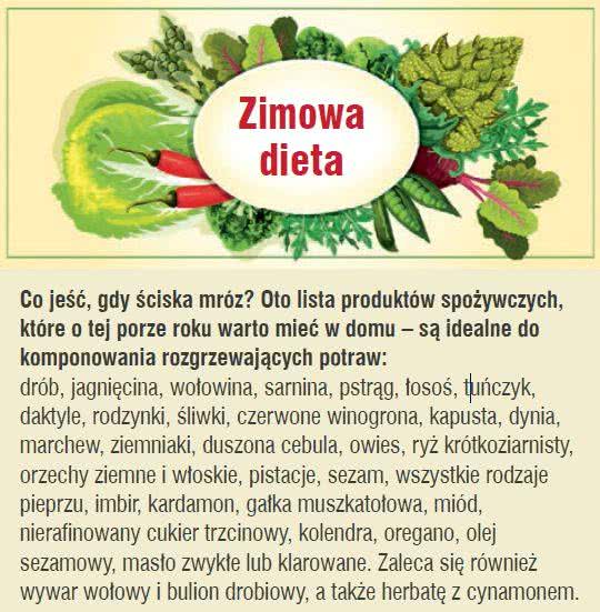 O tej porze roku należy unikać przetworów mlecznych, które powodują wytwarzanie w organizmie nadmiernych ilości śluzu, a ponadto mają naturę termiczną wychładzającą, co ustawia je na końcu kolejki do zimowego stołu. Duże ilości spożywanego nabiału są przyczyną zapalenia zatok i oskrzeli. Zimą nie jest wskazana także surowa żywność, która najczęściej wpływa na organizm wychładzająco. Należy zrezygnować z cytrusów i soków owocowych.