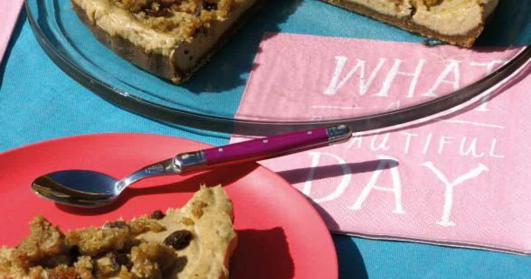5. Aby przyrządzić posypkę, zmiksuj orzechy brazylijskie, daktyle i cynamon w robocie kuchennym i rozsyp je równomiernie na powierzchni placka.