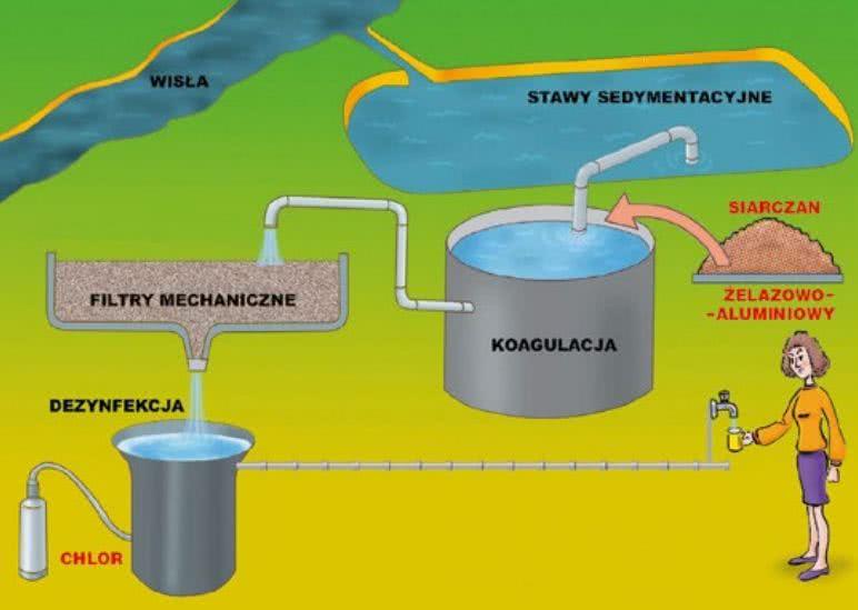 Na ten problem również znaleziono sposób, który stosuje się od ponad 50 lat. Mianowicie dodaje się do wody siarczan żelazowo-aluminiowy: biały, niewinnie wyglądający proszek, który te lekkie części wiąże ze sobą do postaci kłaczków. Te zaś łatwiej opadają na dno zbiornika albo zostają zatrzymane na ostatnim etapie oczyszczania - filtrach żwirowo-piaskowych. Proces oczyszczania wody przy użyciu siarczanu nazywa się koagulacją (również kłaczkowaniem albo żelowaniem).