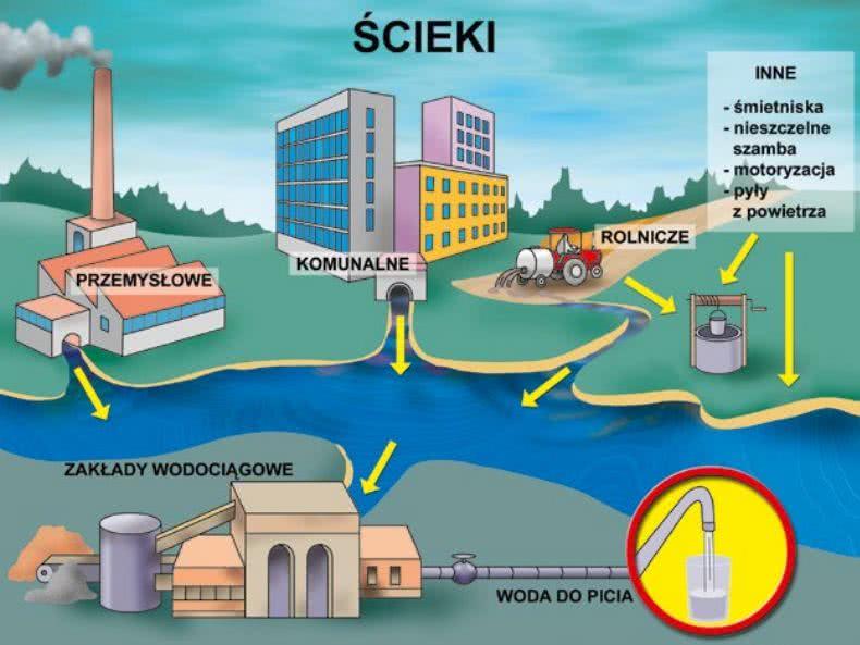 Wszystkie rozpuszczone w wodzie związki chemiczne (najczęściej niewidoczne) w swojej wędrówce dostają się do rzek, które są źródłem wody dla zakładów wodociągowych