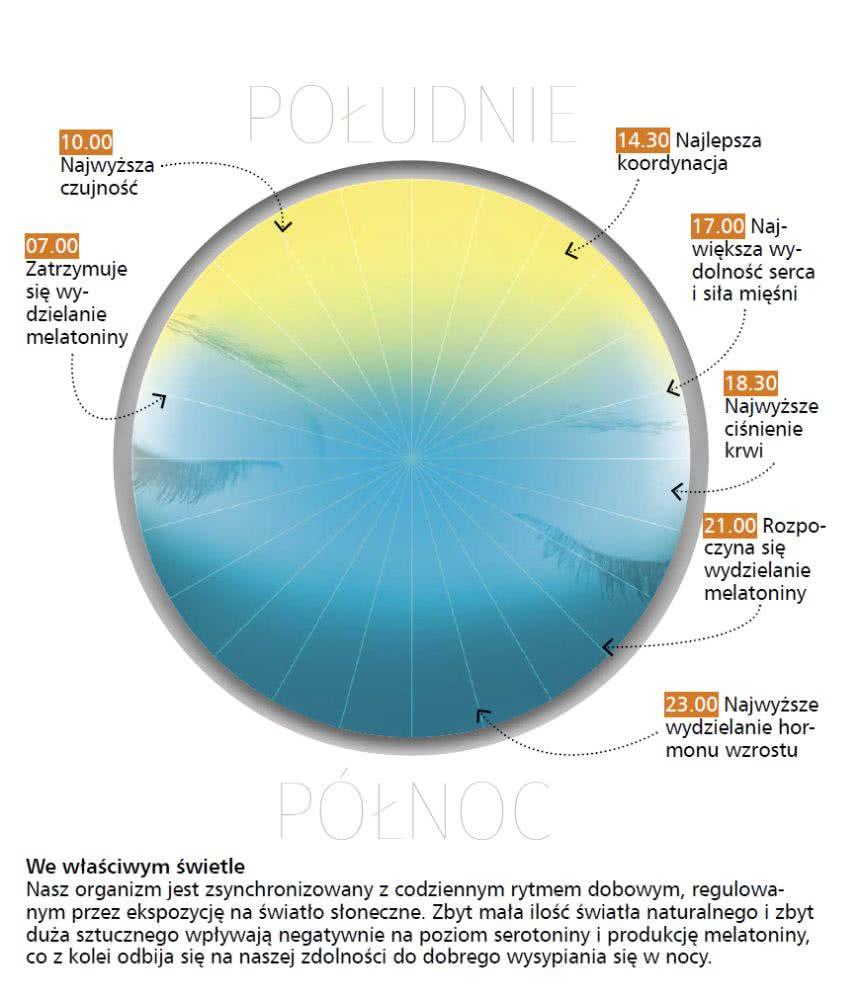 Światło wysyła sygnał do podwzgórza i wszystkich powiązanych z nim organów i gruczołów, by "obudziły się" i przeszły w stan czuwania. Ekspozycja na światło, zwłaszcza słoneczne, uruchamia w organizmie produkcję optymalnych ilości hormonów i neuroprzekaźników dziennych, regulujących nasz zegar biologiczny.