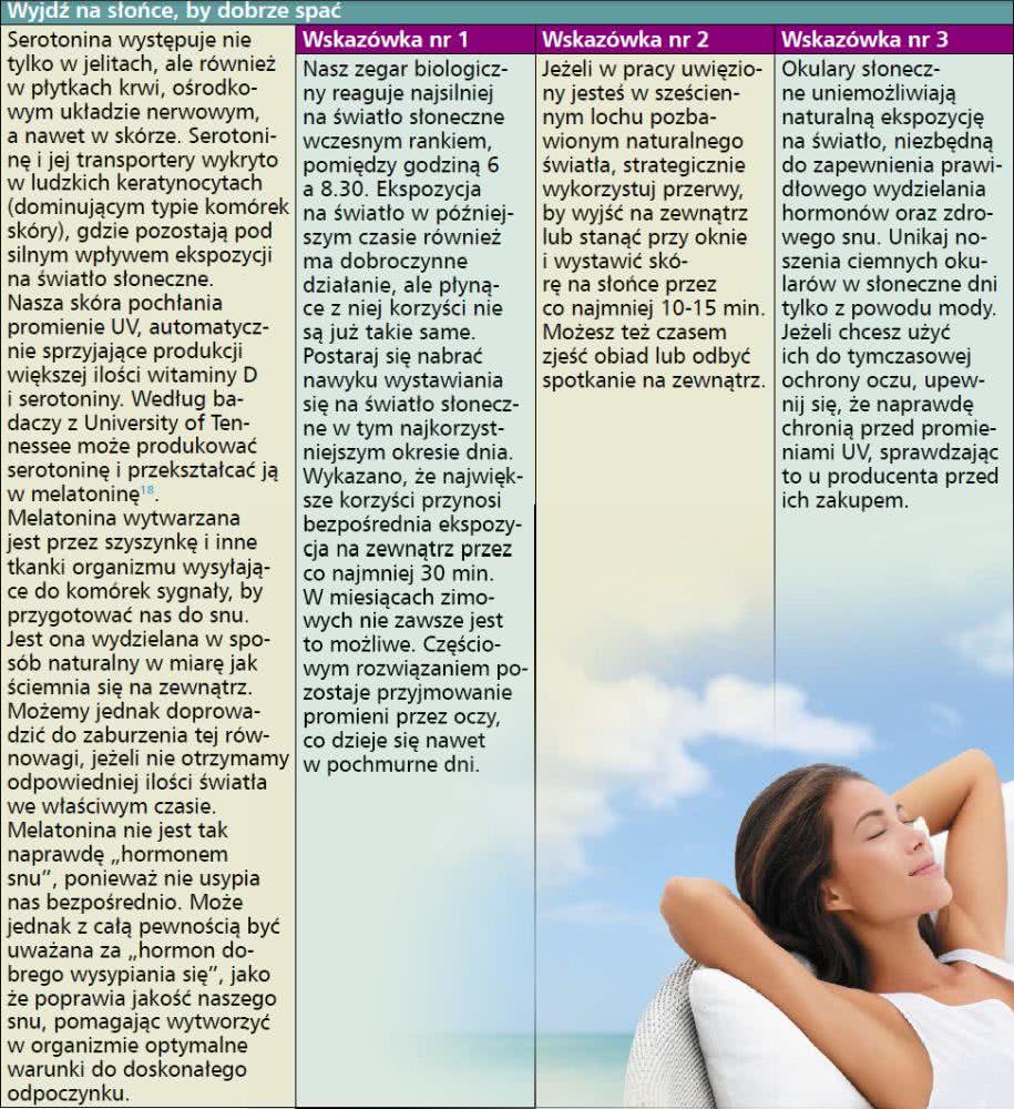 Nasze oczy posiadają specjalne receptory światła, które wysyłają informacje do centrum mózgu (gdzie położone jest podwzgórze), by uruchomić produkcję większej ilości serotoniny. Odbywa się to codziennie, gdy żyjemy w synchronizacji z naturą, a nasz zegar biologiczny nastawiony jest na właściwą godzinę. Jeżeli nie będziemy otrzymywać wystarczającej ilości światła naturalnego, ucierpi na tym produkcja serotoniny.