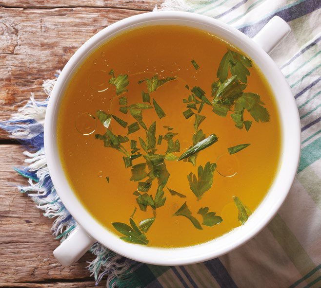 Rosół na kościach z kurczaka, wołowiny, dziczyzny, jagnięciny czy ryby jest bardzo odżywczy dla jelit, a przy tym łatwo przyswajalny. To bogate źródło substancji budujących wyściółkę jelit, m.in. kolagenu, a także aminokwasów, takich jak arginina, glutamina i glicyna, oraz składników mineralnych, jak magnez, fosfor, krzem i siarka. Podczas gotowania kolagenu powstaje żelatyna, która pomaga w rozkładaniu białek i koi wyściółkę układu pokarmowego. Jest pomocna nie tylko w leczeniu zespołu nieszczelnego jelita, lecz również w stymulowaniu soków trawiennych i naprawie wyścielającej śluzówki (patrz przepis na bulion na kościach w ramce obok).