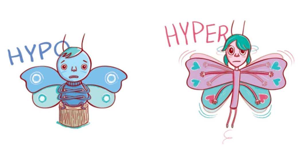 Fot. Motylki (bo taki kształt ma tarczyca) – Hyper i Hypo – cierpią odpowiednio na nadczynność i niedoczynność tarczycy.