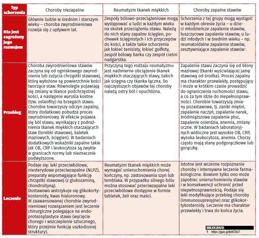 Reumatyzm to pojemne pojęcie. Mieści w sobie ponad 200 jednostek chorobowych, które dotyczą nieurazowych schorzeń ruchu. W dodatku dzielą się one na 3 główne grupy: choroby niezapalne, czyli choroby zwyrodnieniowe stawów, reumatyzm tkanek miękkich (zespoły bólowo-przeciążeniowe) oraz choroby zapalne stawów, fachowo nazywane chorobami układowymi tkanki łącznej1. Różnią się one przyczynami, przebiegiem i sposobem leczenia (patrz tabelka).