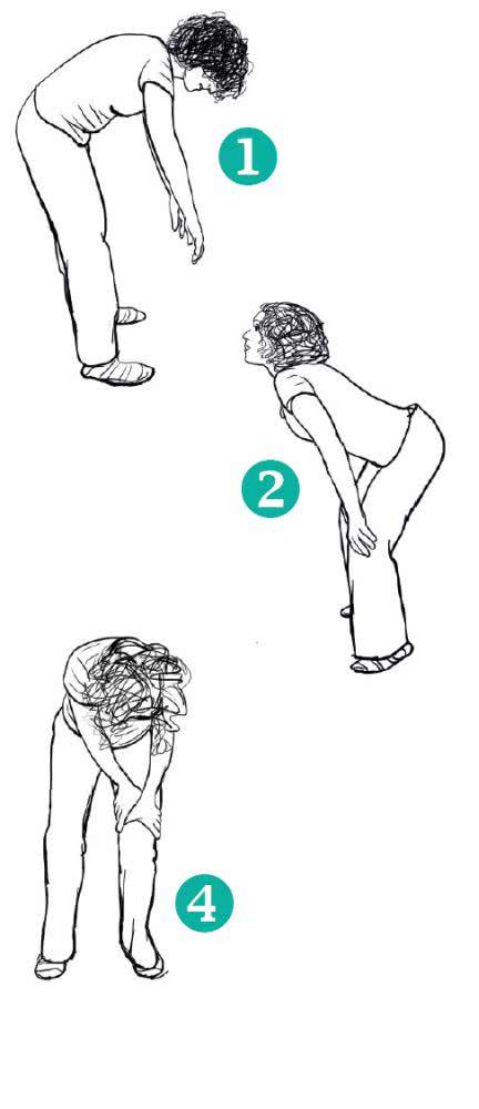 1. Stań, rozstawiając stopy na wygodną odległość, po czym łagodnie pochyl się, pozwalając rękom opaść w kierunku stóp. Sprawdź, dokąd możesz sięgnąć bez forsowania ruchu, a następnie powróć do pozycji stojącej.
