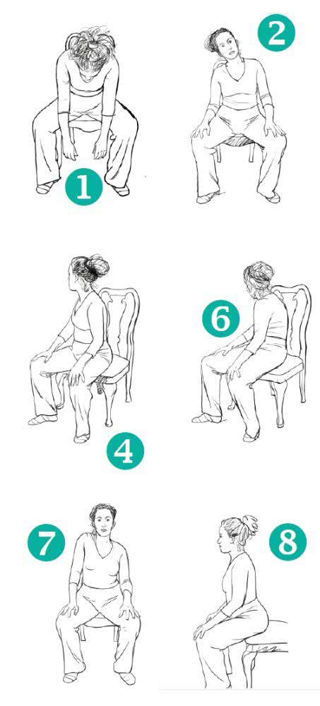 Usiądź wygodnie na skraju krzesła ze stopami rozstawionymi płasko na podłodze na wygodną odległość, rozłóż kolana i wykonaj następujące ruchy.