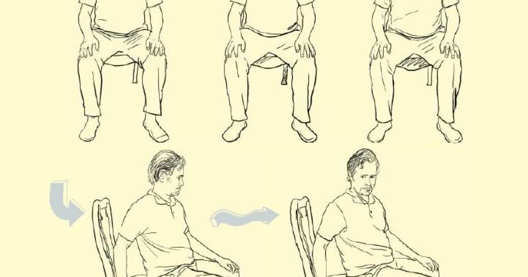5. Wciąż w tej samej pozycji odwróć się w prawo na tyle, na ile swobodnie jesteś w stanie, i zatrzymaj się. Teraz unieś lewy pośladek 2-3 cm nad siedzeniem krzesła i z powrotem go opuść. Powtórz 3-4 razy. Poczuj, jak żebra poruszają się po lewej stronie klatki piersiowej, zbliżając się do siebie i następnie rozsuwając, gdy opuszczasz pośladek z powrotem na krzesło. Zatrzymaj się, wróć do pozycji neutralnej i zwróć uwagę, czy na prawym pośladku siedzisz inaczej niż na lewym.