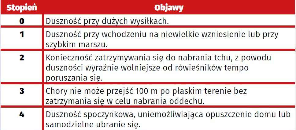 Drugą prostą metodą jest skala nasilenia duszności MRC (Medical Research Council). Co prawda wykorzystuje się ją pomocniczo w celu określenia stopnia nasilenia duszności i zaawansowania choroby24, ale równie dobrze może okazać się pierwszym znakiem ostrzegawczym. Dzięki skali MRC obserwowane u siebie objawy można przyporządkować kolejnym stopniom duszności, przy czym stopień 4 oznacza najcięższą jej postać: