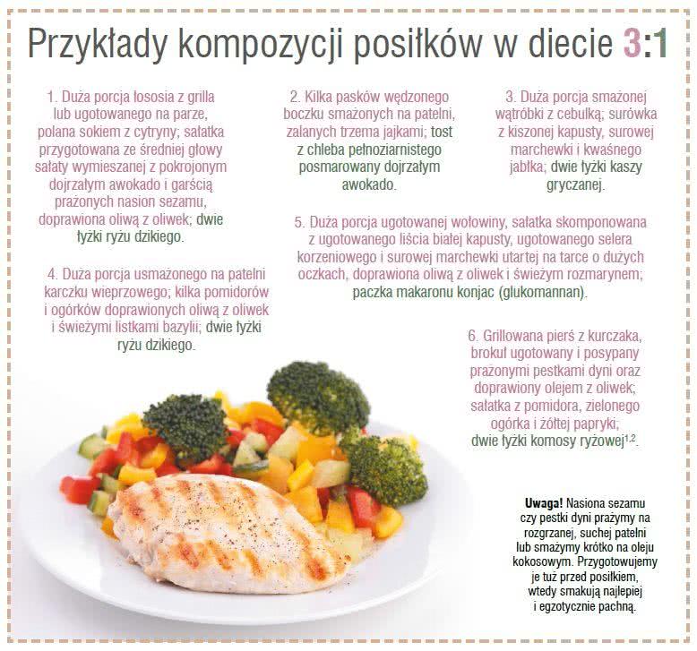 Dla wielu pacjentów najistotniejszą informacją dotyczącą diety 3:1 jest to, że nie jest ona drastyczna ani nie wymaga dużego zdyscyplinowania. Nie narzuca ani rozmiaru talerza, ani liczenia kalorii; nie zabrania też okraszania posiłków skwarkami. Ta dieta odpowiada przekonaniu, że organizm jest zdolny do szybkiego adaptowania się do każdych warunków - gdy ograniczamy ilość jedzenia, błyskawicznie przechodzi na tryb oszczędny. Redukcja ilości pożywienia oznacza więc spowolnienie metabolizmu i gromadzenie zapasów na potem, co jest ostatnią rzeczą, jaką chcemy osiągnąć. Posiłek powinien być na tyle duży, aby zaspokoić głód i nie wzbudzać w organizmie strachu o przetrwanie. Co ważne, musi składać się z konkretnych produktów.