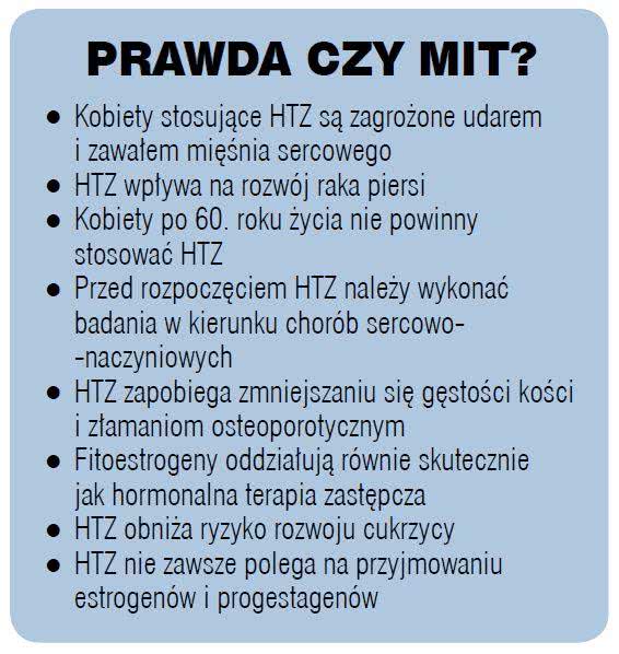 - HTZ nie zwiększa ryzyka wystąpienia chorób sercowo-naczyniowych, jeśli rozpocznie się ją przed ukończeniem 60. roku życia;