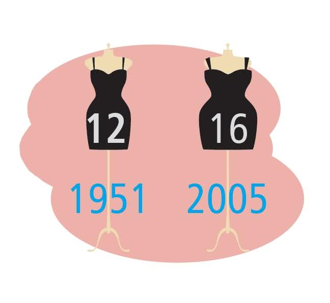 W 1951 roku, przeciętna kobieta w Wielkiej Brytanii nosiła rozmiar 12 (EUR40), zaledwie po 50 latach, mimo popularności diet niskotłuszczowych i mody na wychudzone modelki, średni rozmiar ubrań "urósł" do 16 (EUR44/46).