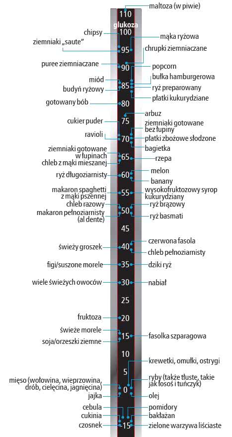 Indeks glikemiczny to metoda klasyfikacji produktów żywnościowych na podstawie ich wpływu na stężenie glukozy we krwi w 2-3 godziny po ich spożyciu. Możesz Masz jeść węglowodany, ale tylko nierafinowane. Naukowcy z Oxford University mierzyli poziom cukru we krwi dwie godziny po spożyciu określonych produktów spożywczych. Glukoza o IG 100. Wszystkie inne produkty (poza piwem) wchłaniane są wolniej, a im wolniej to trwa tym niższy indeks. Ogólnie rzecz biorąc najlepiej sięgać po jedzenie o indeksie glikemicznym niższym niż 50. Warto pamiętać, także o tym, że sposób przygotowania potrawy wpływa na to, jak szybko cukier zostaje uwolniony do krwi, np. gotowana marchewka ma wyższy indeks glikemiczny (IG 85) niż surowa (GI z30).