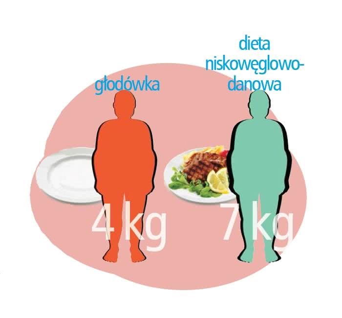 Tylko 3,4 kg tkanki tłuszczowej utracono wyniku głodówki. Podczas, gdy na diecie niskowęgladonowej było to 6,6 kg.