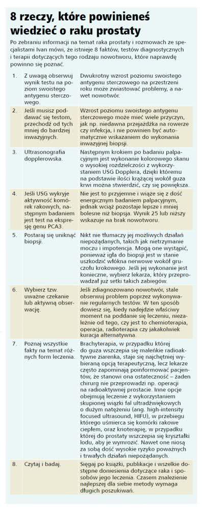 - Radiolog ciągle przepraszał i na chwilę wychodził z pokoju. Zostawałem tam, w bardzo nieeleganckiej pozycji, z pielęgniarką, która mi się przyglądała i nieustannie nerwowo szeroko do mnie uśmiechała - wspomina Ivan. W końcu radiolog wyjaśnił, że ciągle wracał do swojego gabinetu, aby porównać wyniki badania z tymi wcześniejszymi, ponieważ nie mógł dostrzec żadnego śladu raka prostaty.