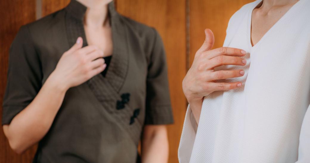 - na wydechu (usta) skieruj ręce do dołu; czubki palców w stronę podłoża; wyobraź sobie, że gromadziszqi, a ona przybiera postać mgiełki, która otacza twoje ciało, żeby cię chronić.