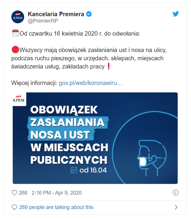 Dziś (9 kwietnia) zaktualizowano polskie zalecenia dotyczące noszenia maseczek lub innych środków ochronnych na twarz. Od 16 kwietnia zasłaniania ust i nosa będzie obowiązkowe.