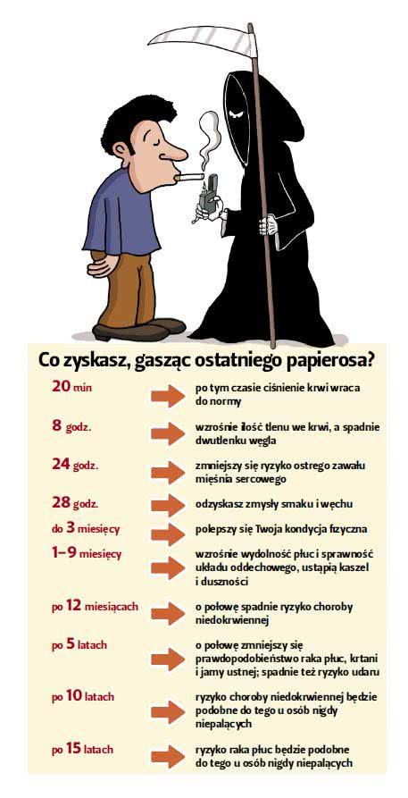 Istnieje jednak również dobra wiadomość: zgubne skutki nałogu nie są nieodwracalne. Już w ciągu kilkunastu godzin od zgaszenia ostatniego papierosa normalizują się parametry ciśnienia krwi, a po kilku miesiącach wzrasta wydolność układu oddechowego i poprawia się kondycja. Potrzeba jednak lat, by zmniejszyć podniesione wcześniej ryzyko rozwoju poważnych schorzeń (patrz grafika na następnej stronie). Badania pokazują jednak, że jest to możliwe.