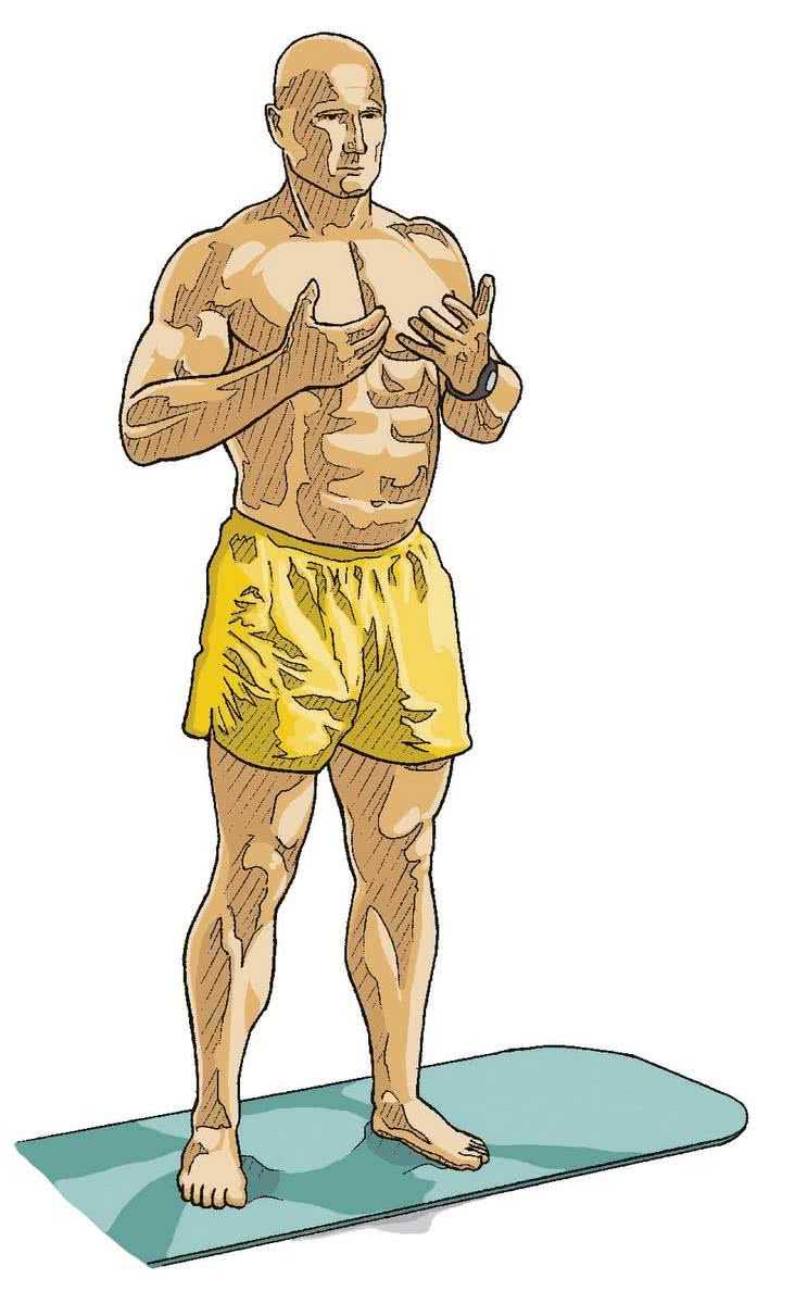 - 2Wykonaj wdech i przywiedź dłonie w stronę ciała.
