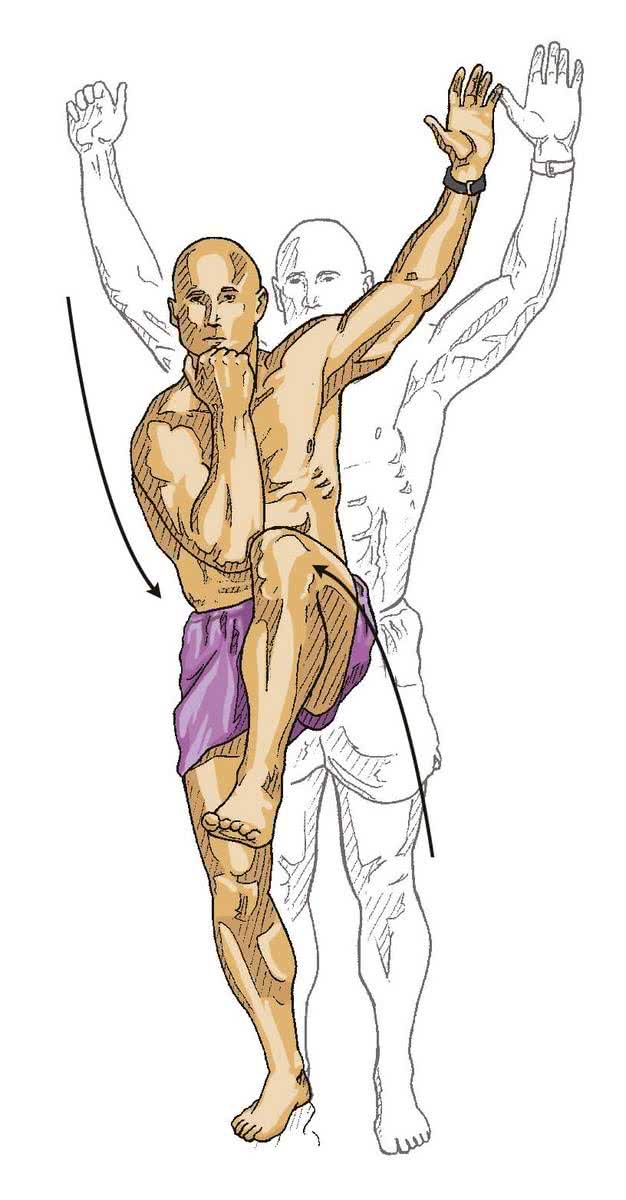 - 2 Unieś lewe ramię i prawą nogę, tak aby znalazły się one mniej więcej na tej samej wysokości. Ramię powinno znajdować się pod kątem 45 stopni w stosunku do głowy z kciukiem skierowanym do góry.