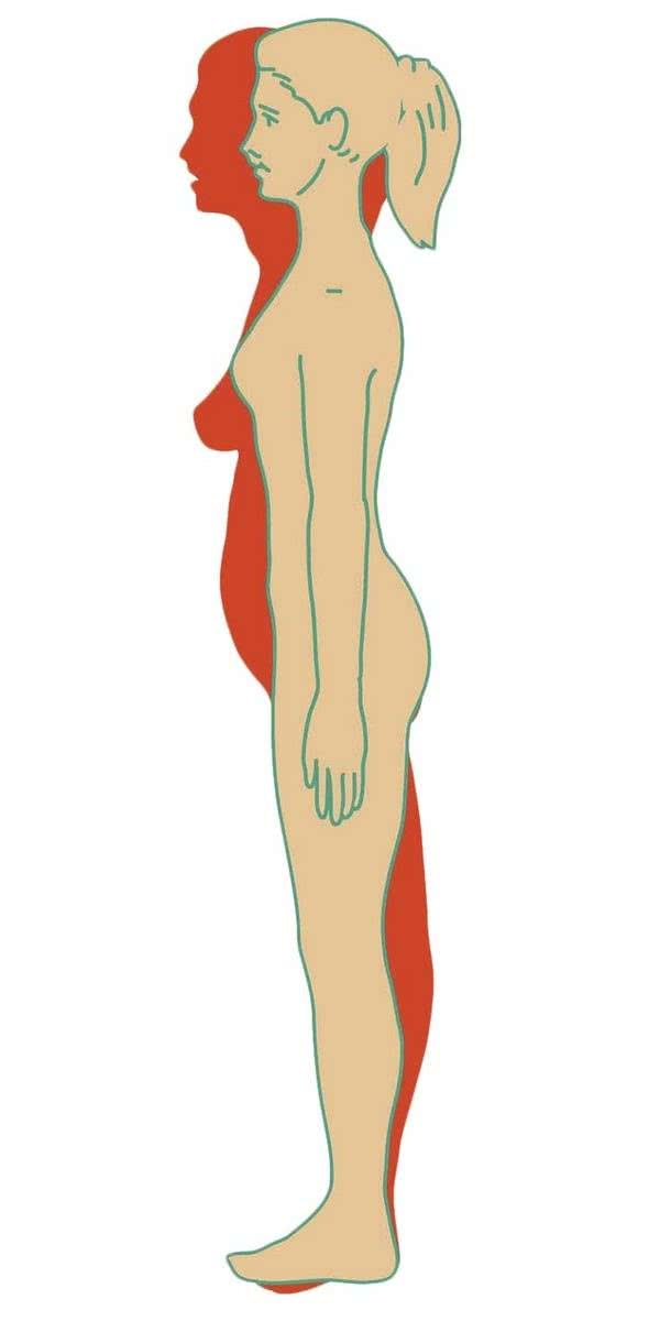 Większość kobiet wszczepiających sobie implanty ma nieprawidłową postawę, od której należałoby zacząć. Na rysunku poniżej figura w czerwonym kolorze pokazuje, jak wygląda typowa kobieca postura. Zwróćmy uwagę na wystającą dolną część jamy brzusznej, opadające piersi i wysuniętą do przodu głowę. U osoby o takiej posturze obciążenie w postaci implantów z pewnością spowoduje chroniczne bóle głowy, szyi, górnej części pleców, ramion, a w końcu również dolnej części pleców. Dodatkowy 400-gramowy lub większy ciężar w postaci implantów w klatce piersiowej kobiety przyspiesza pogarszanie się postawy, które zazwyczaj sprzyja ich zwisaniu.