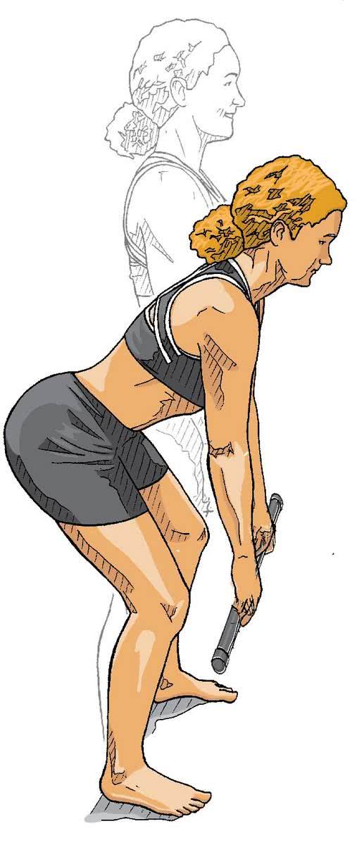 Kiedy opuszczasz ciężarek (drugie zdjęcie u góry), zaciskaj usta, aby spowolnić tempo wydychania powietrza. Dzięki temu utrzyma się ciśnienie w płucach i napięcie ściany jamy brzusznej, co usprawnia jej funkcjonowanie i poprawia postawę.
