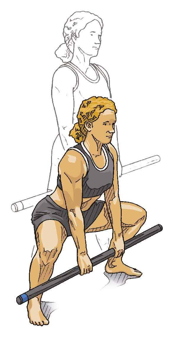 Martwy ciąg (po lewej u góry) to najlepsze ćwiczenie do wykonywania w krótkim czasie. Nie tylko trenuje każdy mięsień ciała, lecz także kładzie szczególny nacisk na mięśnie utrzymujące sylwetkę w pozycji pionowej. Zanim zaczniesz wykonywać to ćwiczenie, stań, zachowując prawidłową postawę z uniesioną klatką piersiową, weź głęboki wdech i wciągnij pępek, tak by poczuć podparcie. Nie pozwól, by podczas podnoszenia ramiona zaokrąglały się do przodu. Stój w pozycji pionowej, dopóki twoja postawa nie będzie właściwa, utrzymuj uniesioną klatkę piersiową i ramiona skierowane do tyłu. Dbaj, by kręgosłup nie przechylał się do tyłu.