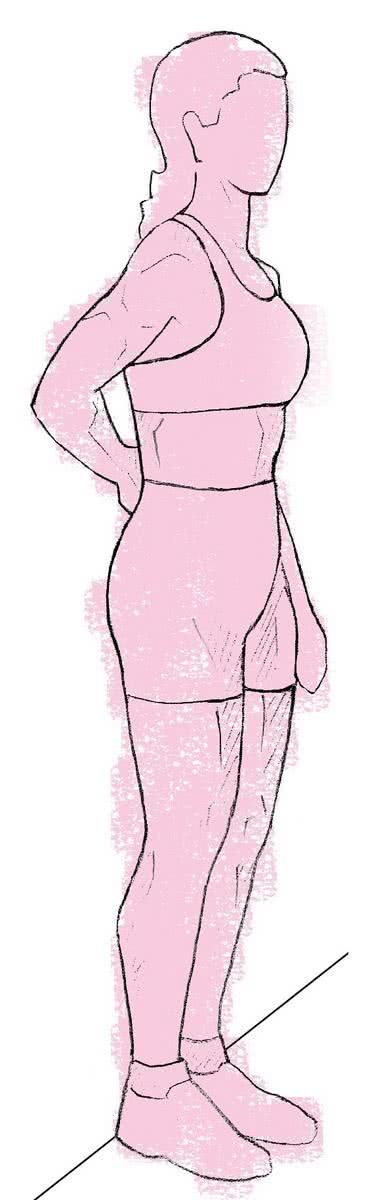Stań przy ścianie, tak aby przylegały do niej pięty, pośladki, plecy i głowa. Pomiędzy ścianę a plecy wsuń dłoń, tak by znajdowała się ona na poziomie pępka. Jeśli grubsza część dłoni nie mieści się pomiędzy ścianą a plecami, prawdopodobnie masz spłaszczoną krzywiznę lędźwiowej części kręgosłupa i powinnaś skorzystać z poniższych, nieco odmiennych wskazówek.