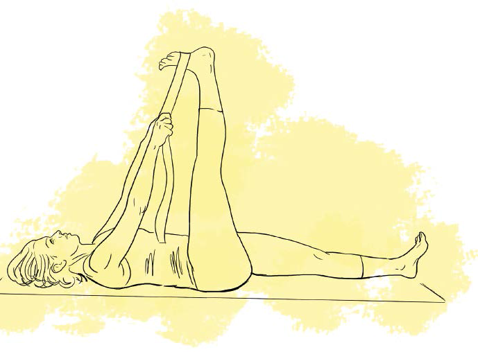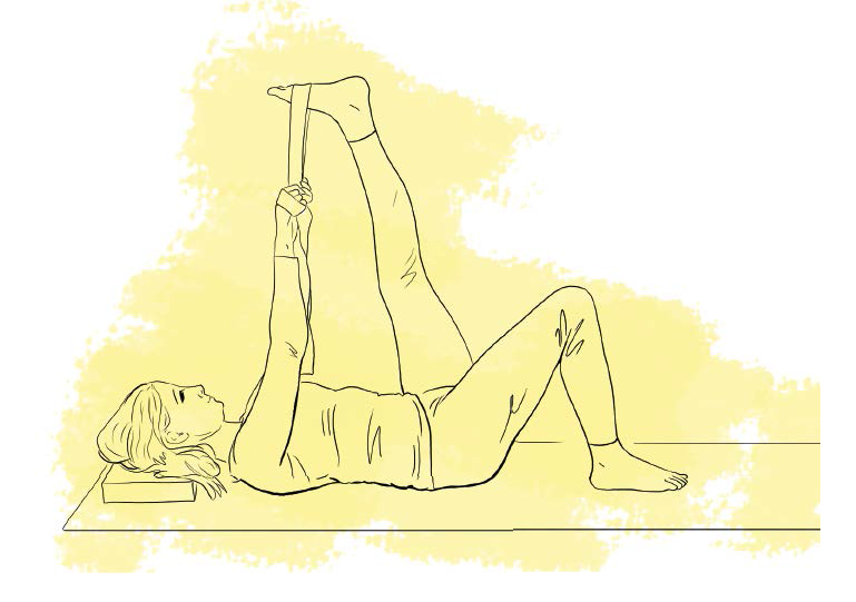 Wersja łagodna: Noga leżąca na ziemi pozostaje w zgięciu, aby złagodzić napięcie w dolnej części pleców i pozwolić, by rozciąganie tylnej części uda miało charakter stopniowy. Zacznij w tej pozycji, niezależnie od poziomu zaawansowania, żeby mięśnie uda miały szansę otworzyć się wraz z rytmem oddechu. Pasek do jogi zaczep o stopę drugiej nogi tuż przed pietą, a oba jego końce trzymaj rękami z wyprostowanymi ramionami i rozluźnionymi barkami. Pod głowę podłóż bloczek lub poskładany koc, by uniknąć powstawania napięć z tyłu szyi.