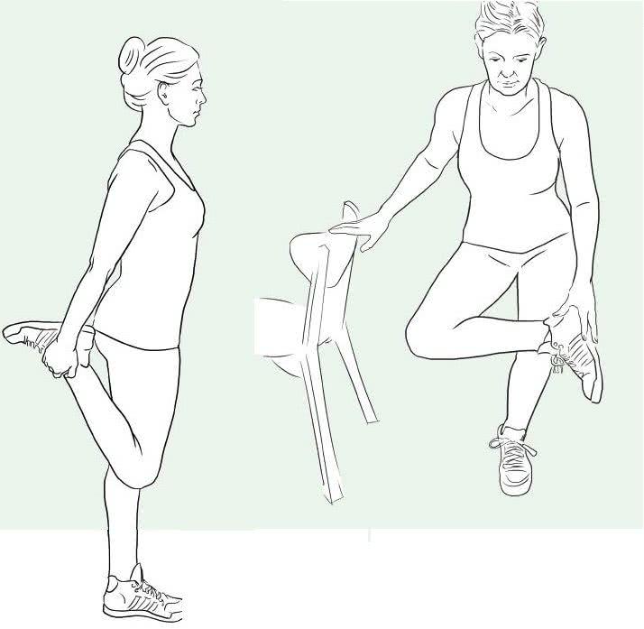 Ta pozycja rozciąga również mięśnie czworogłowe ud. Napięcie w obrębie tylnych mięśni ud i pośladków sprawia, że jazda na rowerze przez dłuższy czas staje się trudniejsza, a ponadto może wzmagać problemy z dolnym odcinkiem kręgosłupa. Wersja dla biegaczy zakłada dotknięcie palcami podłogi, ale jeżeli odczuwasz przy tym ból lub napięcie w dolnych plecach, możesz zamiast tego oprzeć się o krzesło czy ścianę.