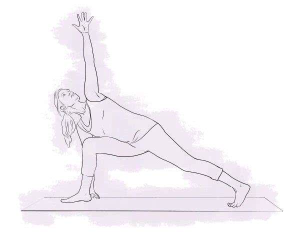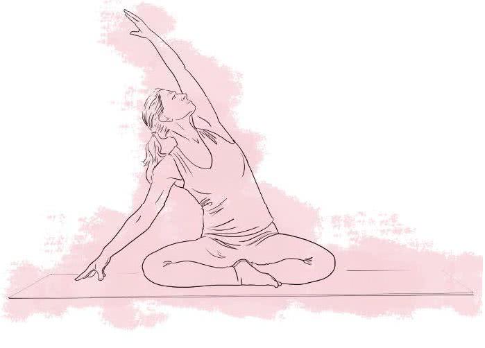 Usiądź na klocku do jogi lub poskładanym kocu i daj sobie kilka chwil na wydłużenie kręgosłupa wraz z oddechem. Następnie rozłóż ramiona na boki, rozluźnij barki i na wydechu opuść lewą rękę, jednocześnie sięgając prawą do sufitu i rozciągając prawy bok. Biorąc wdech, z powrotem unieś lewą rękę i opuść prawą, ponownie wyciągając je na boki. Powtórz wszystkie czynności na drugą stronę.