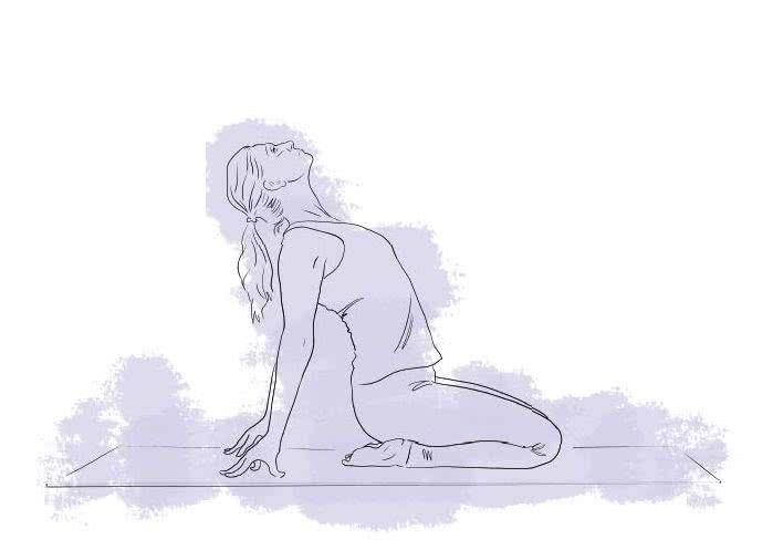 Usiądź na piętach, trzymając kolana blisko siebie (pod pośladki możesz podłożyć poduszkę). Ręce wyciągnij za siebie i dotknij palcami podłogi, wykręcając barki tak, by klatka piersiowa się uniosła, a tułów rozciągnął. Pilnuj, by szyja i plecy jak najbardziej się wydłużyły, co zapewni mocne podparcie głowy. Ściągnij też łopatki, otwierając w ten sposób klatkę piersiową.