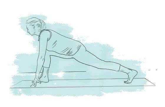 Dłonie połóż na macie, lewą stopę możesz zaś przesunąć nieco w przód, o ile zajdzie taka potrzeba. Pilnuj, by stopy położone były równolegle do maty, na szerokości bioder. Następnie oderwij dłonie od maty i wesprzyj się na samych opuszkach palców, przenosząc ciężar tułowia na mięśnie brzucha i pleców.