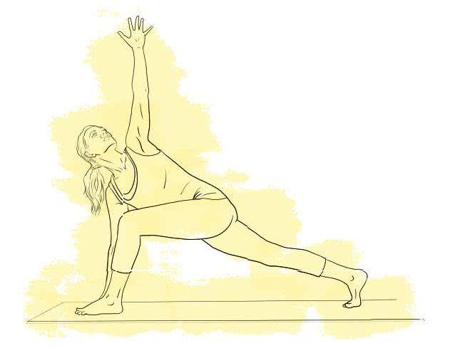 Lewą stopę wysuń o krok do przodu i przekręć o 45º w prawo. Zegnij lewe kolano w wypadzie, pilnując, by lewe udo pozostawało równoległe do maty, a lewe kolano wskazywało ten sam kierunek co stopa. Blokując łokieć lewej ręki za lewym kolanem, wyciągnij prawą rękę w górę.