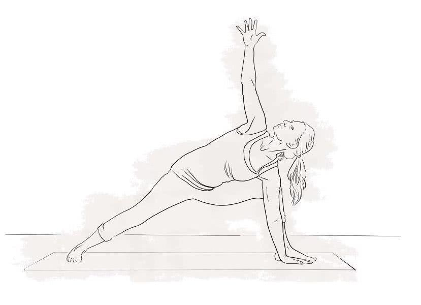 Unieś klatkę piersiową i bezpośrednio pod nią dotknij maty lewą dłonią (jeżeli czujesz, że kręgosłup nie wyprostował się jak należy, możesz podeprzeć dłoń na klocku). Wykręć biodra odrobinę w prawo i zwróć tułów w tę samą stronę, wyciągając jednocześnie prawą rękę w górę.
