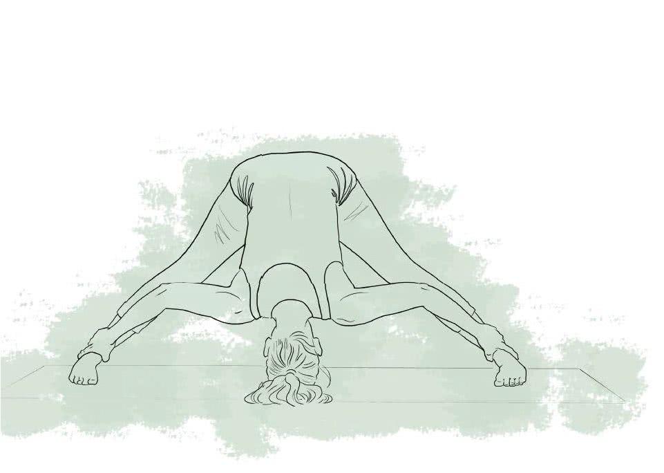 Rozstaw szeroko nogi w taki sposób, by zewnętrzne krawędzie stóp były równoległe do maty (chroni to stawy kolanowe). Dłonie oprzyj na udach i powoli zsuwaj w dół, jednocześnie wykonując głęboki skłon w przód. Rozluźnij szyję i pozwól głowie opaść swobodnie. Staraj się rozprostować nogi, wciskając podstawę palców w matę i utrzymując łuk stopy jak najwyżej, a jednocześnie pilnując, by pięty nie odrywały się od podłogi.