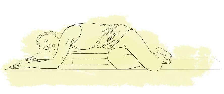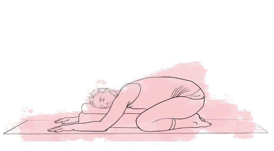 Usiądź na piętach z dużymi palcami stóp blisko siebie. Kolana rozłóż na tyle szeroko, by pod tułów podłożyć podparcie (np. poskładany koc) bez unoszenia pośladków z podłogi. Przesuń ręce w przód, aby tułów oparł się swobodnie na podparciu i zwróć twarz w jedną stronę, a potem w drugą. Oddychaj spokojnie oraz głęboko i poczuj odprężenie ogarniające całe ciało.