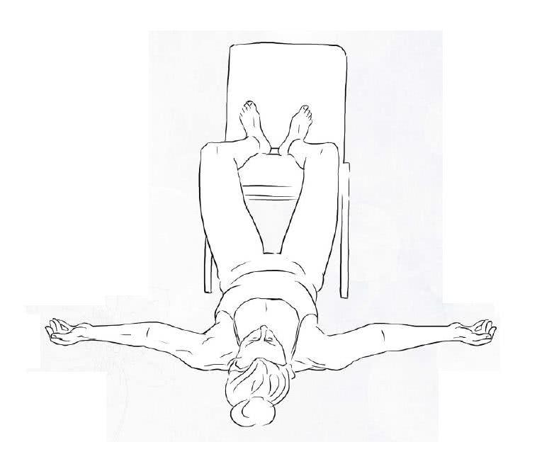 Łydki oprzyj na siedzeniu krzesła, aby jak najbardziej wydłużyć dolny odcinek kręgosłupa.