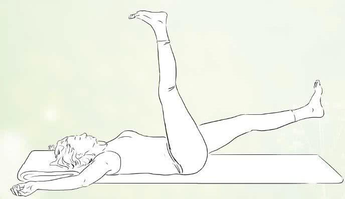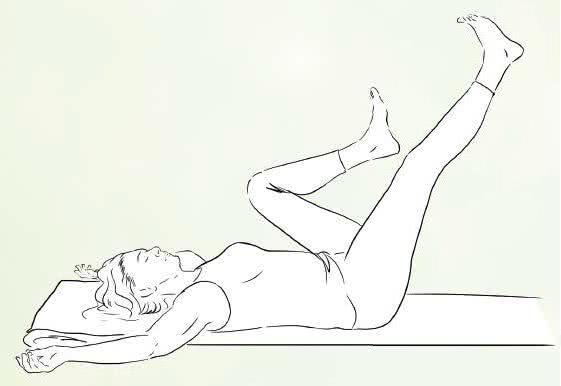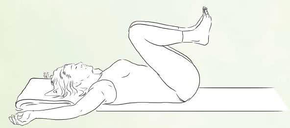 Przyciągnij kolana do klatki piersiowej, aby odciążyć dolne plecy - w tej pozycji weź głęboki oddech. Następnie wyprostuj prawą nogę w kierunku sufitu, a lewą równolegle nad podłogą, zadzierając palce stóp do kości piszczelowych, co zaangażuje mięśnie posturalne i przyspieszy krążenie. Rozluźniając żuchwę, na wdechu przyciągnij nogi z powrotem do klatki piersiowej, a na wydechu wyciągnij lewą w kierunku sufitu, a prawą nad podłogą i kontynuuj na przemian.