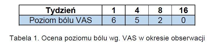 Po 16 tygodniach terapii odnotowano całkowite wygojenie rany, reepitelializację, eliminację martwicy, zapalenia i ropnej wydzieliny. Ból – oceniany na wizualnej skali analogowej (VAS) – zmniejszył się z poziomu 6 do 0.