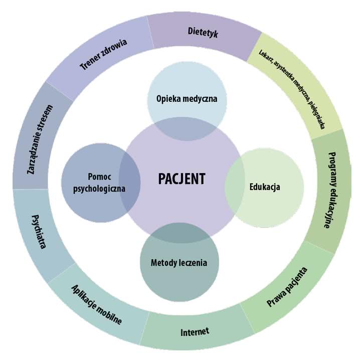Takie podejście przedstawia schemat dr. Korzenika. Na zewnętrznym kręgu zostały wymienione wszystkie "narzędzia", którymi pacjent powinien nauczyć się posługiwać dla własnego dobra.